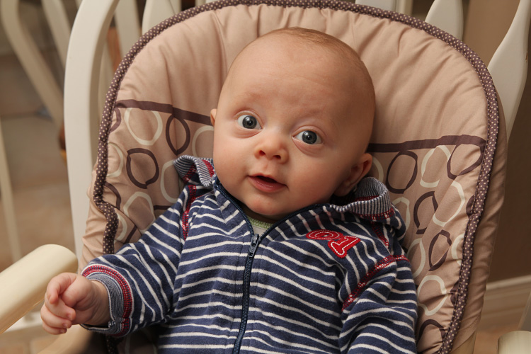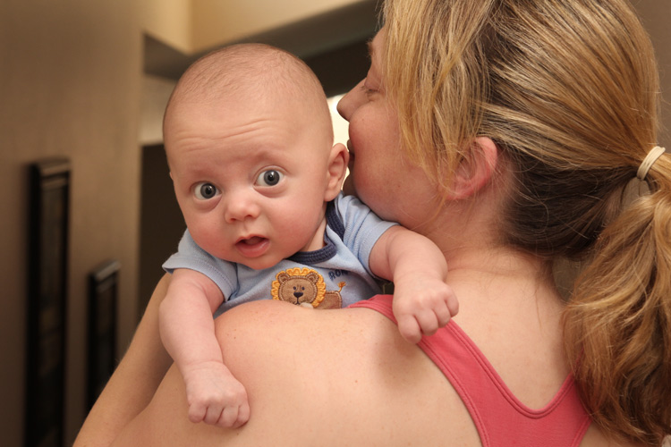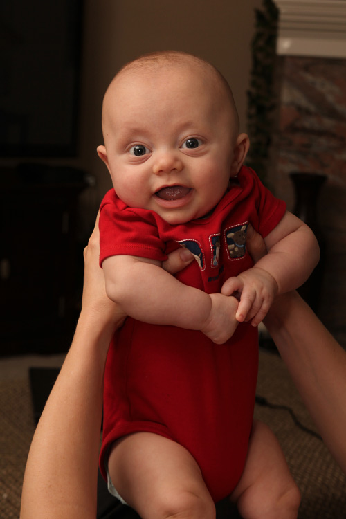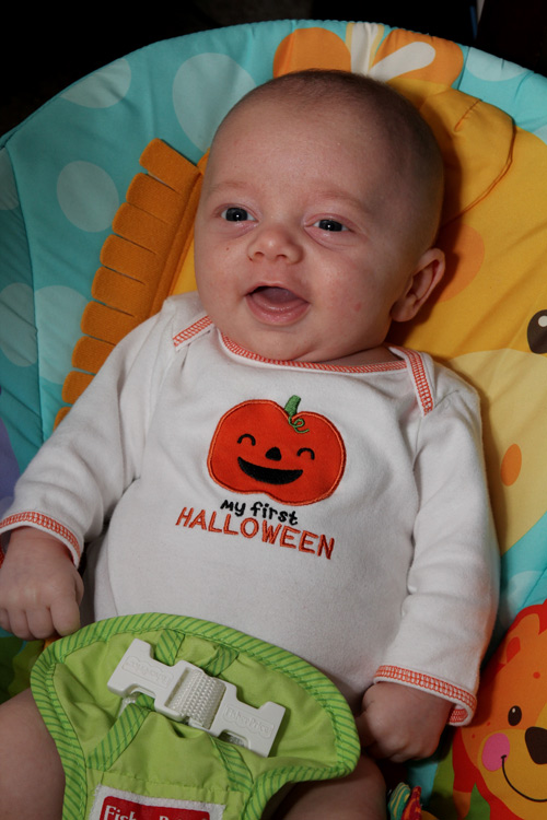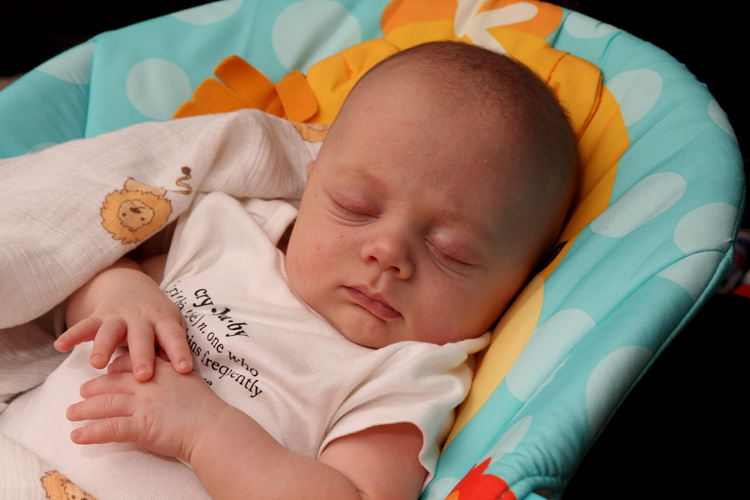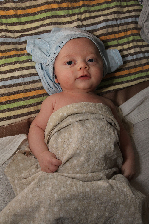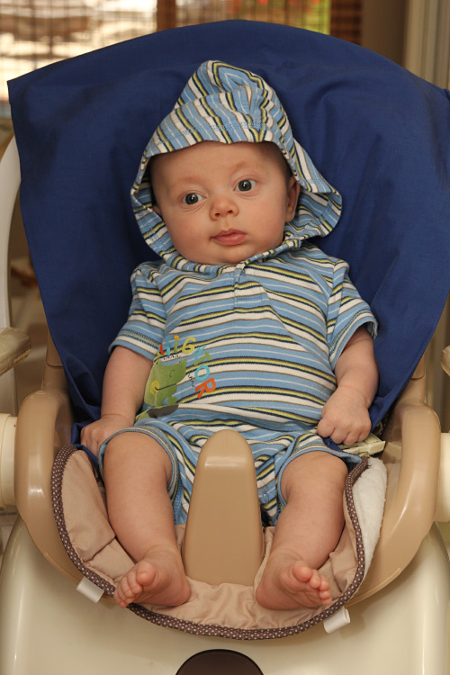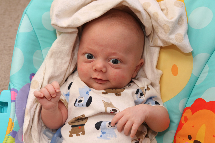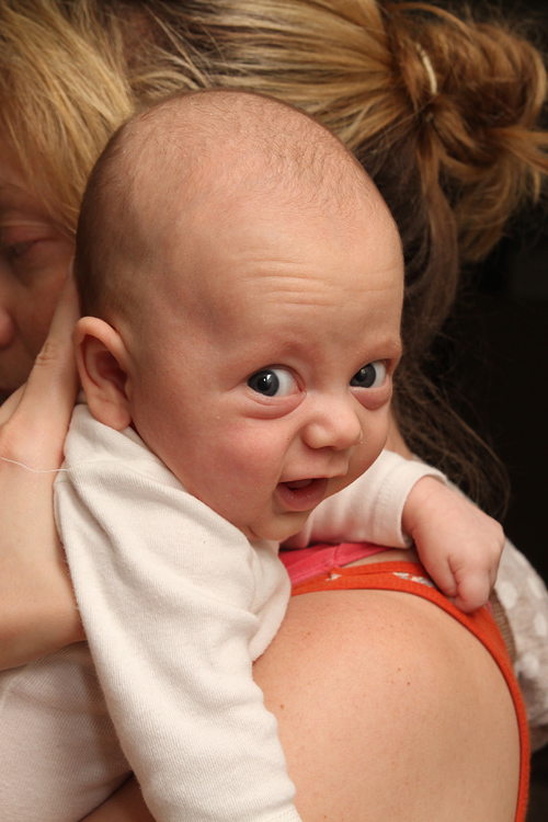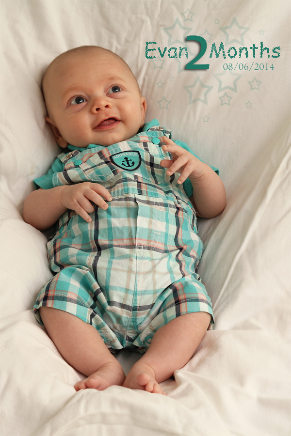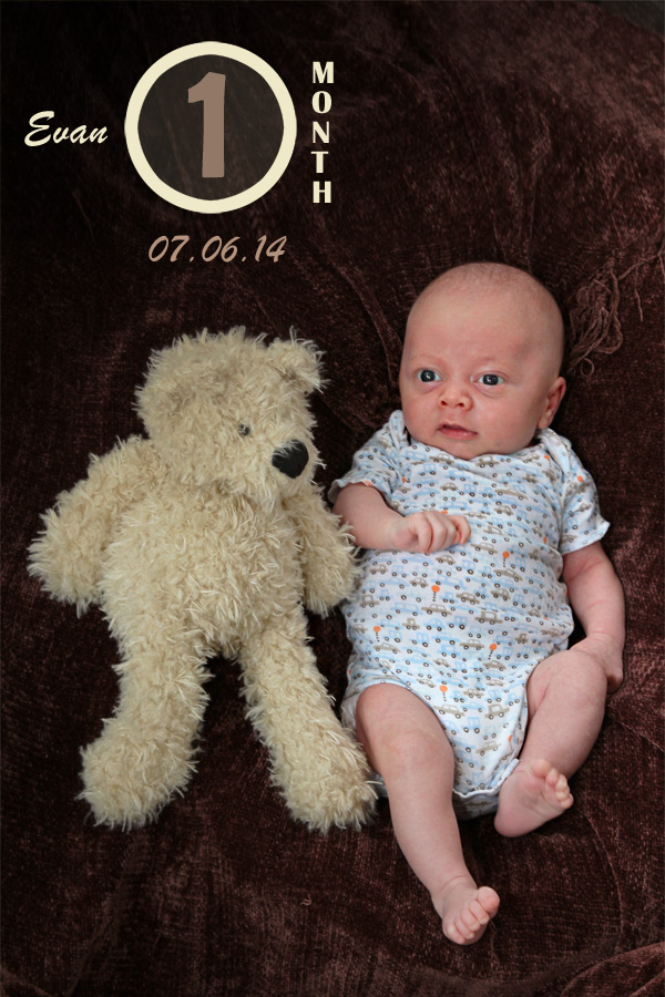 Other expected developments this month included Evan revealing his smile to us. You can usually get him to show it if you tickle his cheek and say “Hi, cheeky-cheeky”. He also likes to look around the room when there are a lot of people and activity. He finds this amusing and will sometimes grin as he bounces his big eyes around the room. And of course we love his little coos and other baby sounds. Sometimes you think he’s trying to say something, and it’s true that some of the cute sounds he’s making are just letting us know he’s happy. Evan’s baby acne also cleared up by the end of the month. So, until he’s a teenager, he’ll probably be clear of that. Also, his hair seems to be staying in. Unlike Calan, who lost his initial fuzzy head (and started over), Evan’s seems to be getting ever so thicker and darker. We’ll all be wondering what coloring he’ll end up with. No matter what he’ll be our “Little E” with many similarities to his big brother but for sure his own person as he continues to grow and grow.
