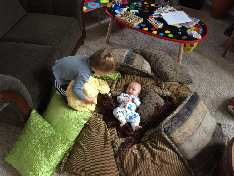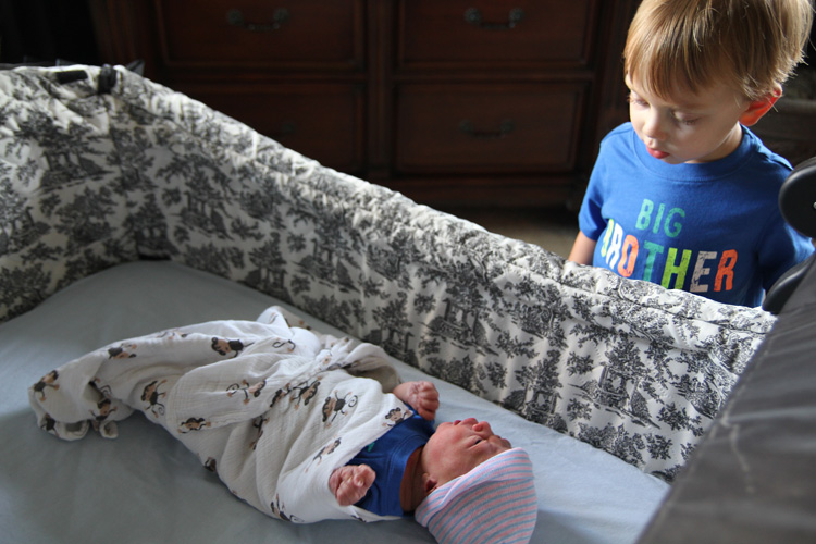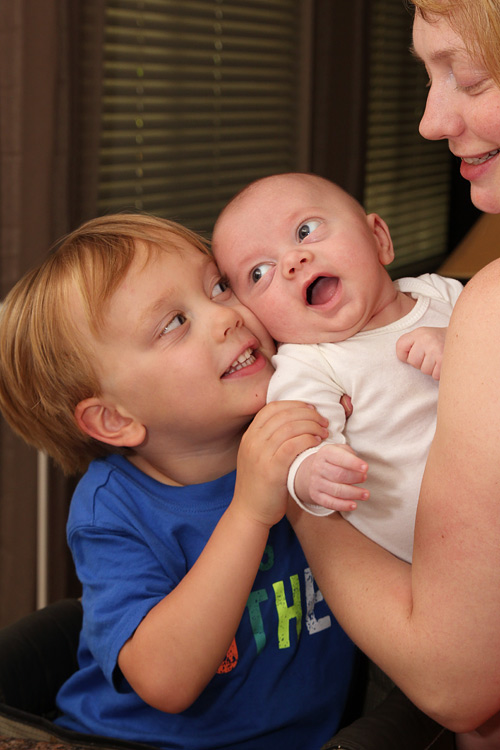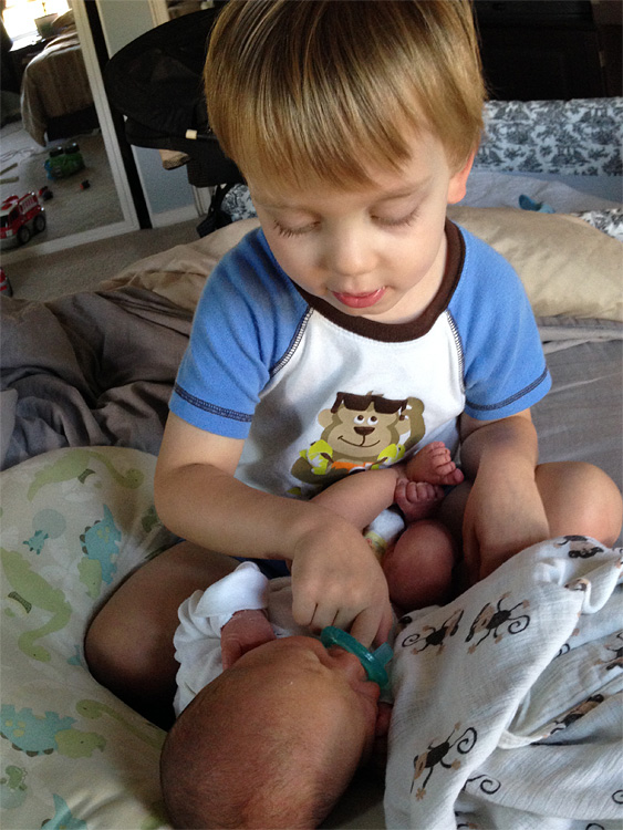 It’s especially entertaining to watch him with Calan. His older brother seems to really love babies, and his baby brother is no exception. Calan lights up when Evan comes into the room or when he greets him at his bassinet after a nap. The two will look at each other as Calan leans in close speaking softly and reaching for tiny body parts gently. In fact. they’ve already created their first game: Calan will position his head close to Evan, and within a matter of seconds a little arm or hand will graze Calan’s head or face, which causes Calan to smile with glee proclaiming “He got me!”.
