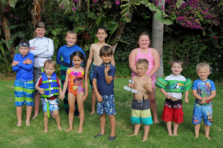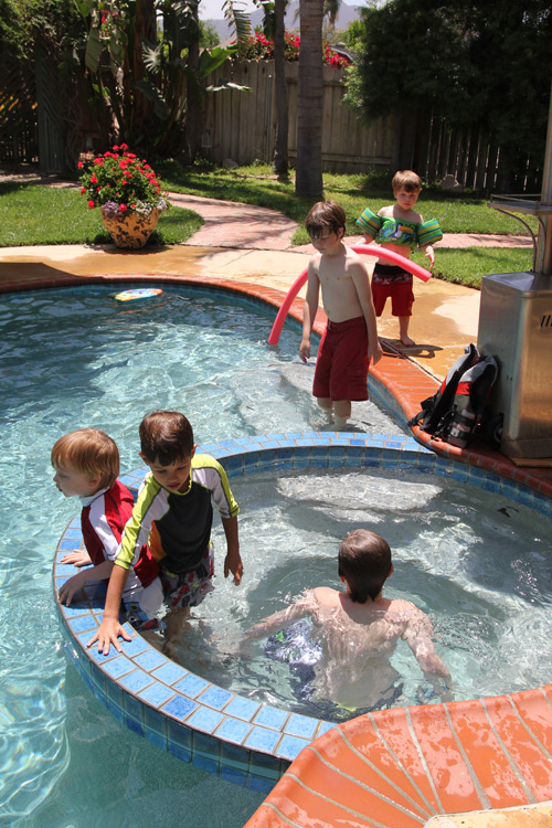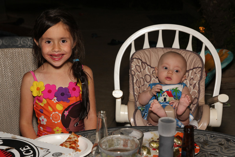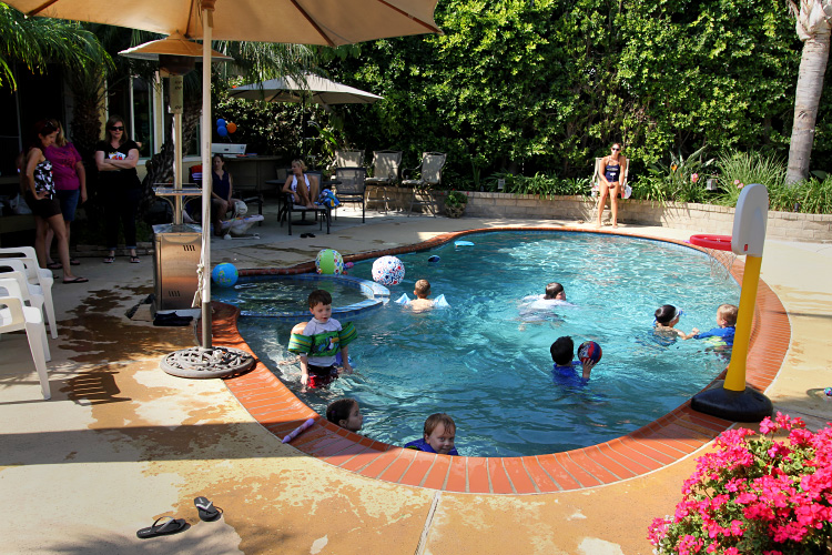 As for the party, it was just right. Warm weather, a backyard pool and a relativity small group of close friends made for a perfect afternoon. The kids all had fun playing in the water and around the yard, and enjoyed the Little Ceasar’s pizzas we put out. The pizzas are what make the food portion of the actual party incredibly easy. Another way we made this pool party easier on ourselves was to hire a lifeguard to watch over the kids as they played in the pool. This allowed all of the adults to relax and enjoy visiting with each other. And of course, Calan enjoyed opening up some really great presents from everyone at the end of the party.
