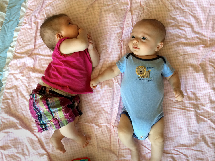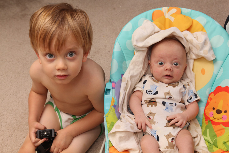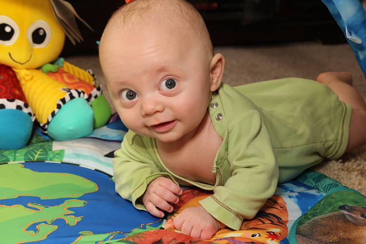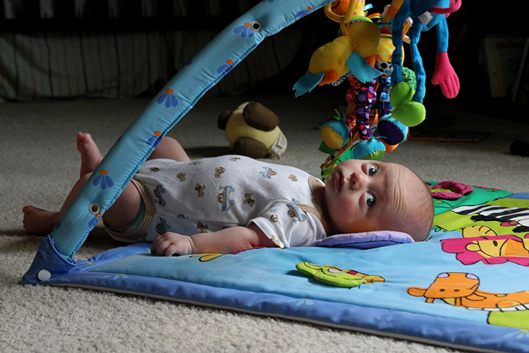 As for having a second newborn/infant, this time around we are much busier when you factor in all the usual activities you do with the older sibling. And as every parent of multiple children will tell you, the baby simply has to come along for the ride. Evan is always there for the little things we do with Calan each day, like sitting right next to his older brother at meal times (which Calan loves), or being positioned nearby while Calan plays with his toys (and Mama and/or Dada prepare a meal), or hanging with us as we do Calan’s bedtime routine, including reading a book sometimes. He also joins Calan for other activities such as swimming, sitting poolside in his bouncy seat while Calan and Dada splash around, or when we join up with the neighbors in their front or back yards for a late afternoon “hangout”. And even during play dates, Evan tags along while his big brother plays and socializes with a buddy. He’s a trooper and is usually pretty happy hanging out or sleeping during these outings. And of course, when Calan is napping or has gone to bad, that’s when we get a chance to be with just Evan. Aside from feedings, we love playing with Evan. One favorite is lying down next to him on his mat and initiating tickling games. This brings us and Evan lots of smiles. You just can’t beat that.