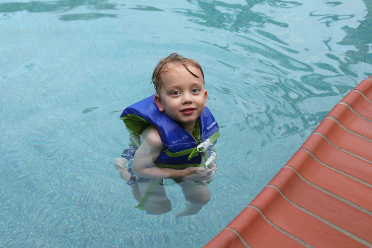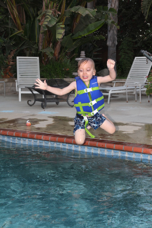 Swimming: Despite not really getting into his swim classes last month, the little guy finally got comfortable again in the “big” pool. The keys to this seemed to be letting him make the decision on when to actually “go swimming”, let him “be” while he’s in the water, and of course dawning a floaty vest. It also helped seeing his friend Declan from two doors down, who is also three, swim in the “big pool”. Whatever the ingredients for success, it’s been nice seeing Calan have fun in the water. He really enjoys floating, kicking and splashing around in the backyard pool. He doesn’t go every day, but two or three times a week seems to give him his fill. It’s also been great centering his eagerness for swimming around small pool parties with friends. Several visitors, including Declan, Benni, and Jake (plus brothers) have come over to cool off in the pool this month, giving Calan a chance to both see his friends and have more practice being in the water. He even seems to choose the pool over going to the beach where the waves are still a little scary. One outing we made to cool off in the water though was to the neighborhood to the west of us (Village at the Park). They have a small “splash pad” with several fountains raining out water when you push a button. In his typical fashion, Calan was completely content with just pushing the buttons and standing under the refreshing spray, while the other children there ran all around and slid down the park slides with slippery, wet bodies. It looked like a lot of fun, but Calan knows what he likes for sure, and you can rarely convince him to try for more in the moment.