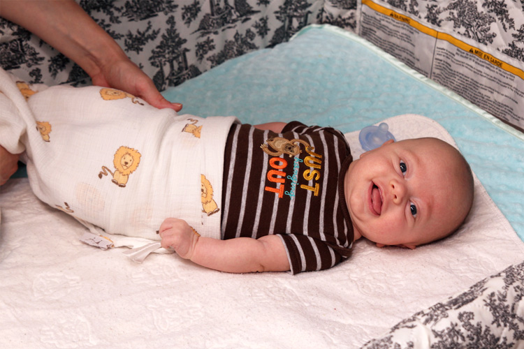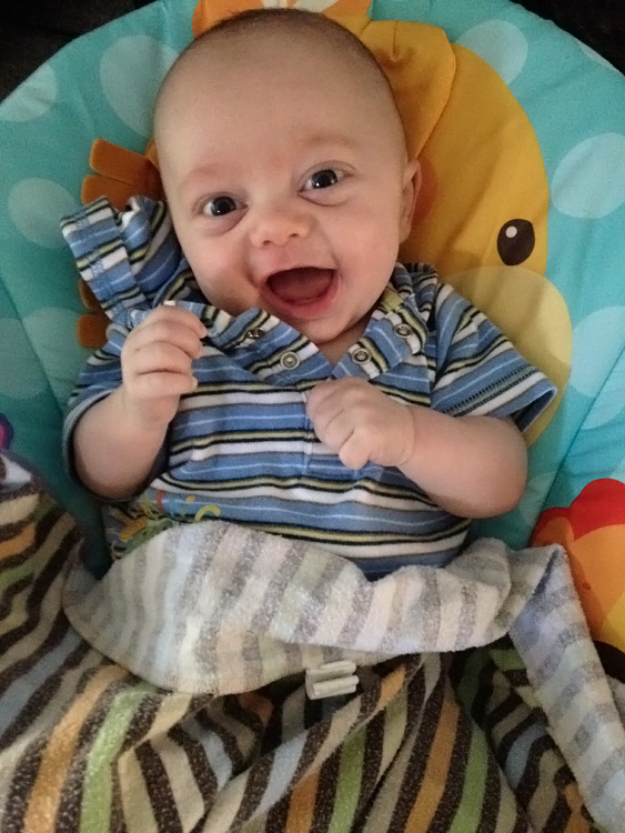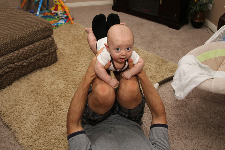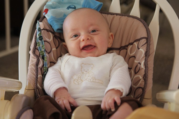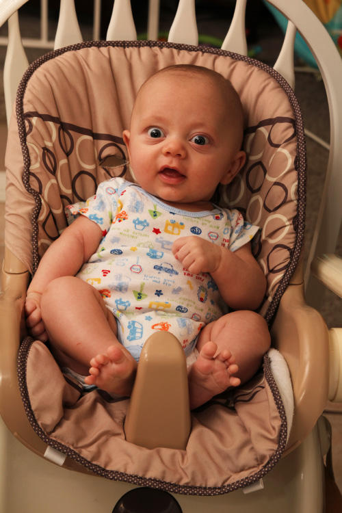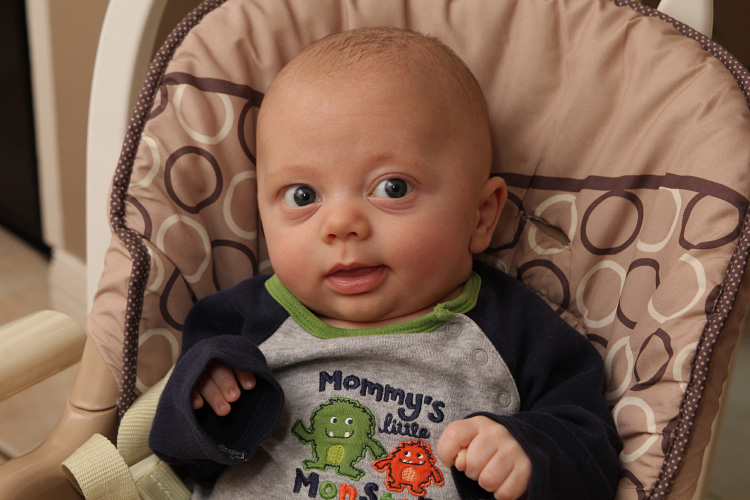 One aspect we’d like to forget sooner than later is Evan’s sleeping habits during this month. At some point, his nighttime sleeping cycle fell off, and waking several times in the night to nurse became more the norm. The shorter stretches of sleeping and waking up to eat told us he isn’t getting enough to eat during the day. But what was confusing was that he was already eating quite a bit. For example, he’ll chug around 40oz. of milk per day, and pediatricians will tell you other babies his age usually only require 24-32 ounces in a day. So, even though it’s early we decided (with his doctor’s approval), to start adding powdered rice cereal to his milk. We even started some “solid” foods with mushed up banana and peas to supplement the diet further. This came with mixed results. You could even say a bit of a back-fire because Evan’s system adjusting to the new foods certainly didn’t make him comfortable, and we were in for some rough patches for a few days. We say that Evan is really in “no man’s land” right now because he needs more food apparently, but isn’t totally ready for hearty, solid foods yet either.