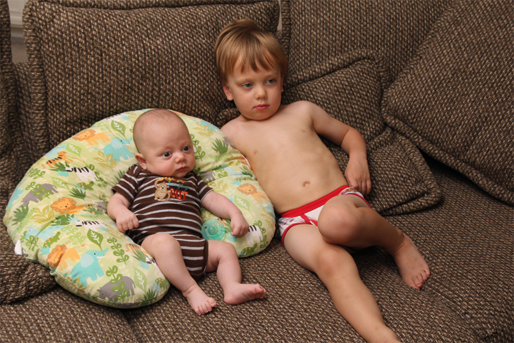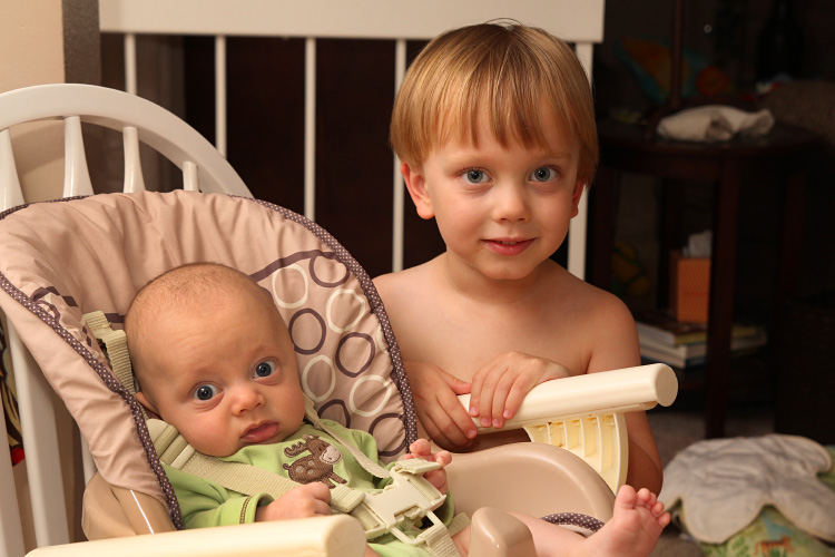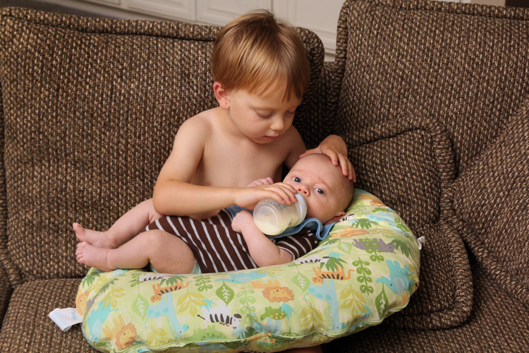 It finally came time for Evan to try a bottle this month as Mama going back to work is just around the corner. He took right to it, and was a complete natural. He doesn’t seem to be picky when it comes to the bottle type or temperature of the warmed up milk. Calan on the other hand had to have his bottles just right, or he’d let you know. The fun things about bottles this time around is that so far, if Mama is away during the day and it’s time to feed Evan, Calan is quick to ask if he can give the bottle to his baby brother. Of course, it’s one of the cutest sites you’ll see in our house. Dada also looks forward to starting the bonding tradition of giving Evan his late night bottle before both go to sleep for the night.