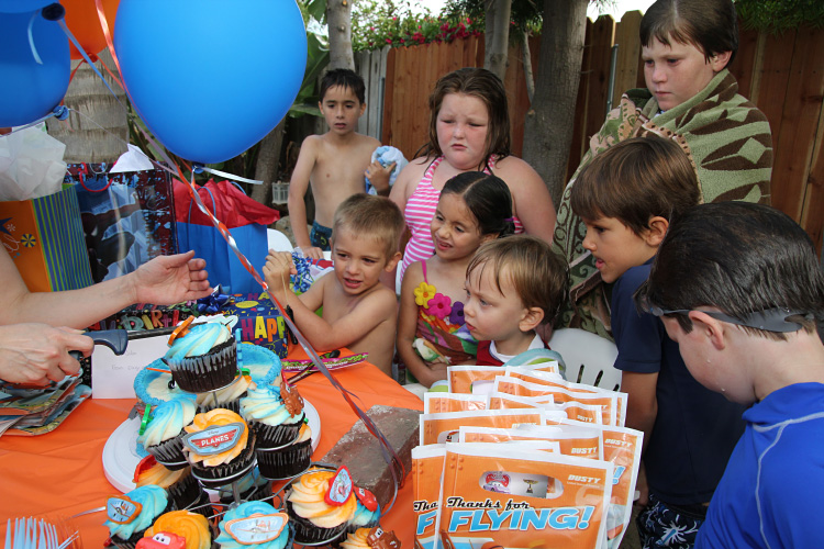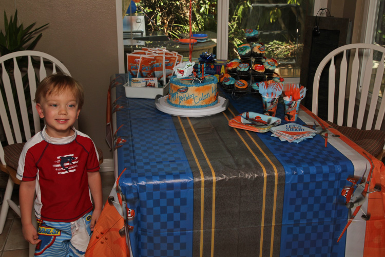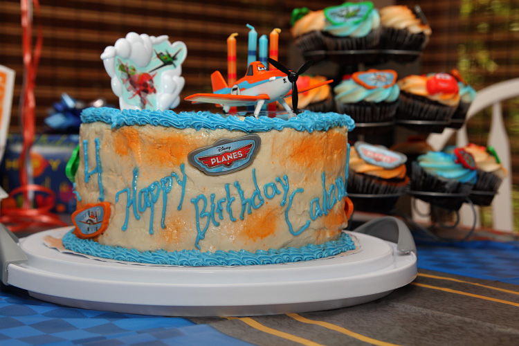 Turning four and birthday party: Calan fell in love with the movie (and book) “Planes – Wings Around the Globe” earlier in the summer. He’d spent hours playing with some of the Planes characters he received during Gran’s visit ;), flying them through the virtual skies within our house almost every day . So it seemed fitting that he would want a birthday party theme all about…well, Planes. This of course meant finding all the appropriate decorations to make this Planes party come to life. As popular as it is and being Disney, this wasn’t too hard. Heidi did a great job of securing the basics: cupcakes, table cloths, plates, plastic ware, napkins, party favors and balloons with matching color ribbon. The most important piece though? Cake. Not as easy… Buying a Planes cake wouldn’t be so bad, but finding one without the possibility of peanut contamination is where the catch is. This meant making one from scratch. Calan also requested a cake with strawberries inside, and so, Heidi was up for the baking task. Through much research, careful planning and dedication, Heidi managed to bake and decorate the perfect Planes cake. Complete with the main character Dusty perched on top, Calan absolutely loved it.  Great job, Mama! “Piece of cake”, right? 😉