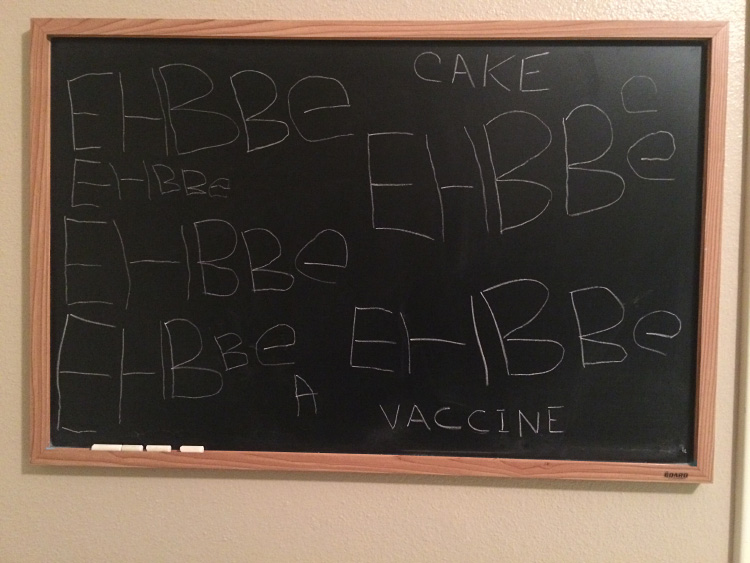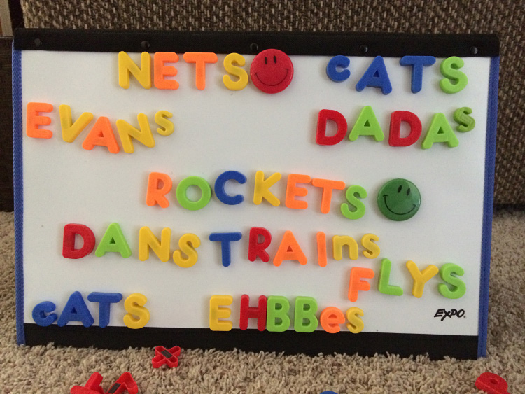 Spelling and Letters: One developmental highlight this month is Calan really starting to show an interest in letters. In particular, he began having fun learning how to write multiple letters on the chalkboard in his room. Once he got the hang of a few, he was eager to write some basic words out. In addition, he started to venture into more serious spelling than ever before with his little colored, magnetic letters. He’s had the letters for a while now, and in the past, he was content to just spell “cat” or his favorite creation “EHBBe”. But suddenly, he took an interest in learning how to spell other words. For instance, one morning he grabbed some flash cards and proceeded to find the letters to spell the words “gestures” and “furious”. He does most of his writing and spelling in the mornings, where he seems to have the greatest patience and reserve for when difficulty arises… such as wanting to spell bigger words off the top of his head for the first time.
